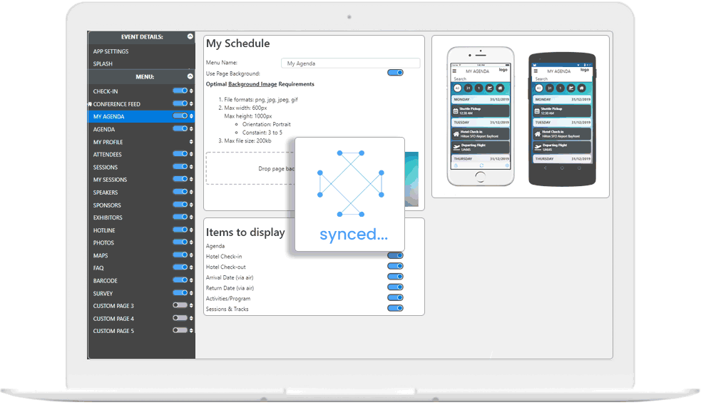 Once your event native app is automatically generated by Lenos Studio, with real-time integration of registration data, sessions, and all your website data, customize with Sync’s visual design wizard. Easy drag and drop, uploads and switches to create a custom design and layout.