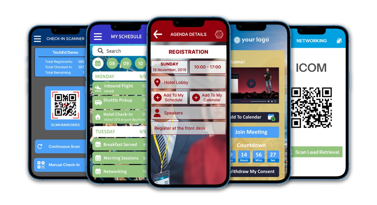 Attendees can mutually scan each other's app for peer-to-peer networking, and sponsors/exhibitors can scan for lead generation with real-time reporting.